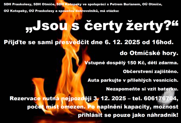 Přijďte se sami přesvědčit dne 6. 12. 2025 od 16hod.do Otmíčské hory. Vstupné dospělý 150 Kč, děti zdarma. Občerstvení zajištěno. Auta parkujte v přilehlých vesnicích. Nezapomeňte...